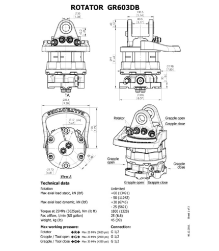 Informazioni Tecniche Rotation unlimited Max axial load static, KN (lbf) 60 (13491) Max axial load dynamic, KN (lbf) 30 (6745) Torque at 25Mpa (3625psi), Nm (lb ft) 1600 (1180) Rec oilflow, l/min (US gallon) 25 (6.6) Weight, kg (lb) 38 (84) Massima pressione di lavoro Rotator Max 25 MPa (3625 psi) G 1/2 Grapple / Tool Open Max 20 MPa (2900 psi) G 1/2 Grapple / Tool Close >G< Max 30 MPa (4350 psi) G 1/2 Connessione G 1/2